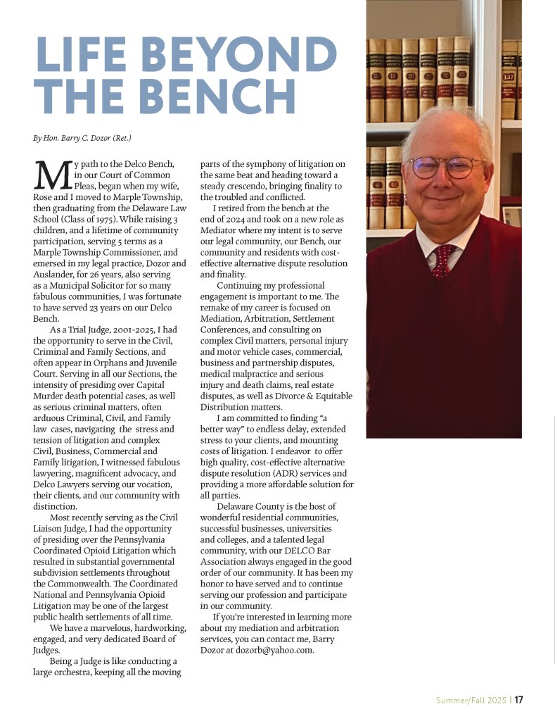 - Honorable Barry C. Dozor (Ret.) often participated in Pennsylvania State Trial Judges Conferences and panels of continuing Judicial education, as well as participating faculty in various Pennsylvania Bar Association, Delaware County Bar Association, Montgomery, and Philadelphia Bar Association continuing education events. As a prior Pennsylvania Bar Association Civil Litigation Section Delegate and Council Member, he continues to participate in Civil Law seminars, also a participating faculty member of PBI continuing education, including “Four County Civil Practice”, often participated in seminars as to “Views from the Bench”, “Practicing Do’s and Don’ts”, and “Trial Practice tips from across the Counties”